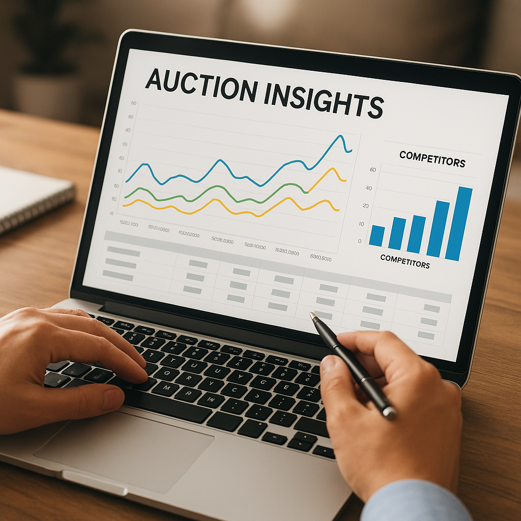 Auction Insights to raport generowany przez Google Ads, przedstawiający porównanie wyników Twoich reklam z wynikami innych podmiotów, które brały udział w tych samych aukcjach. Raport nie pokazuje tożsamości wszystkich konkurentów (czasami wyświetla tylko kilka nazw), ale prezentuje kluczowe wskaźniki, które pomagają zrozumieć, w jaki sposób Twoje reklamy radzą sobie w stosunku do innych uczestników rynku.