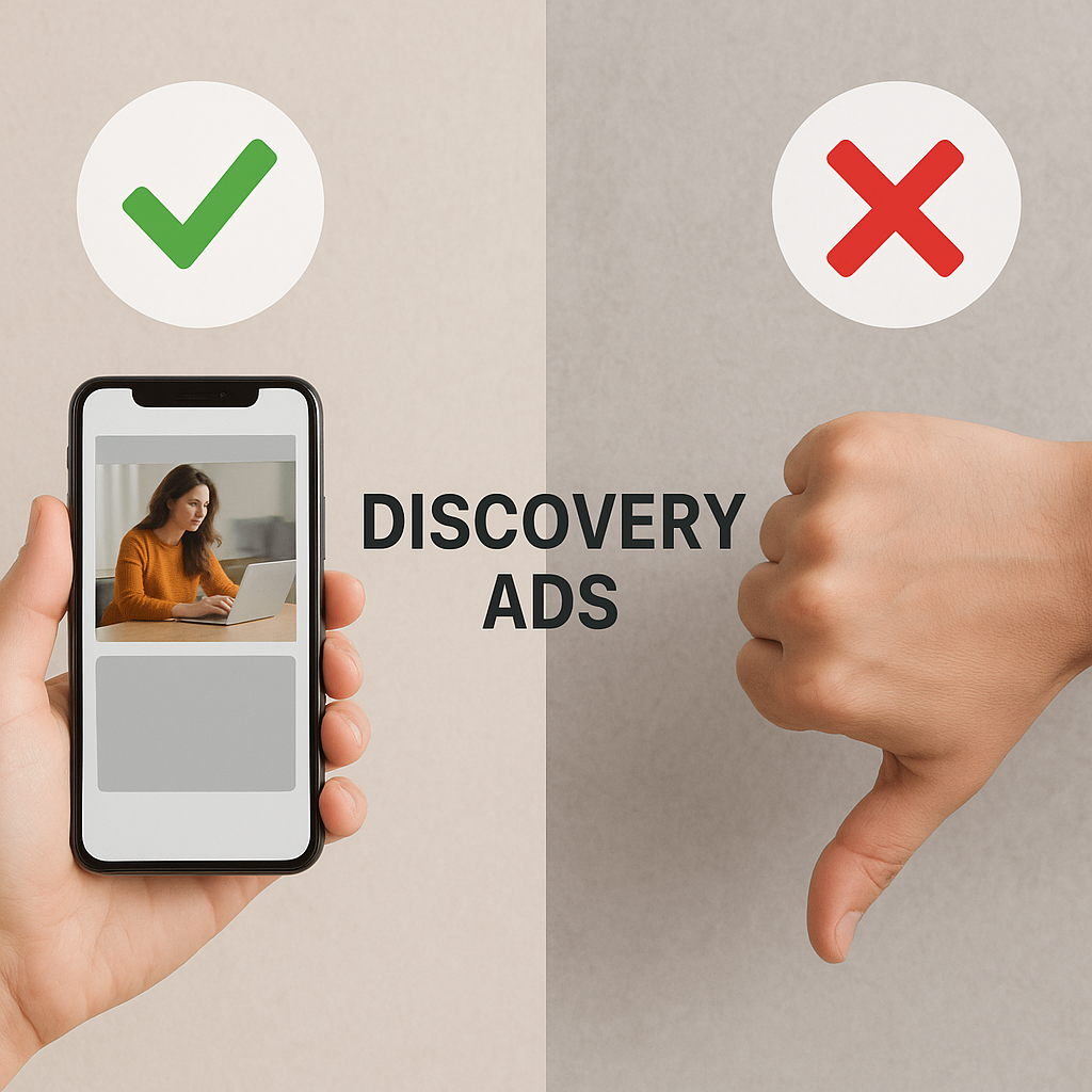Discovery Ads są projektowane jako elementy wizualne w feedzie — nie przerywają doświadczenia użytkownika tak gwałtownie jak pop-upy czy agresywne banery. To zwiększa szansę na pozytywny odbiór reklamy i mniejsze ryzyko irytacji odbiorców.